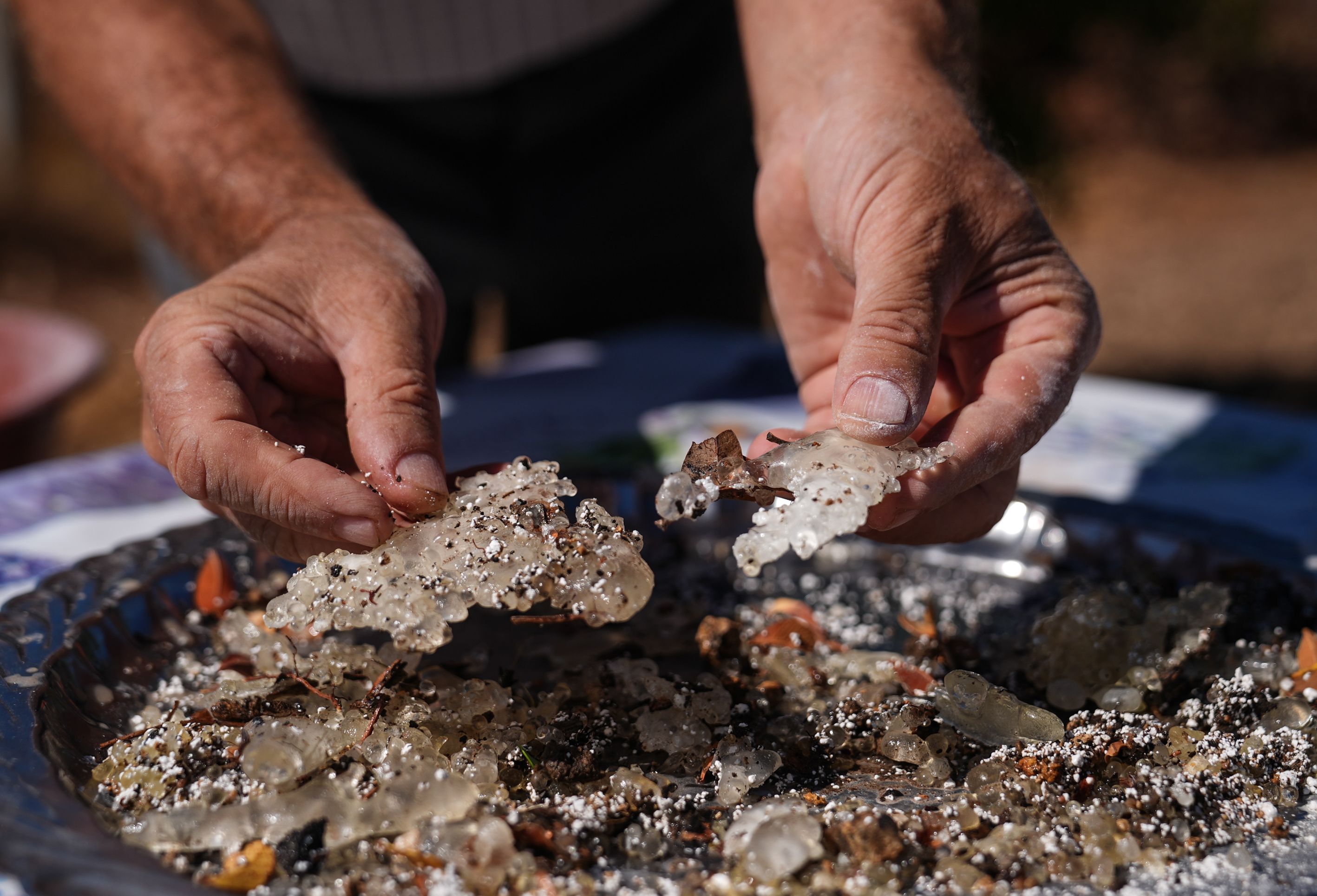 Bu yıl ilk kez hasat yaptığını ve 13 kilogram sakız elde edeceğini anlatan Yalçın, “Sakız ağacıyla atıl araziyi ağaçlandırarak verimli hale getiriyorsunuz. Sakız ağacı su istemediği için de suyu koruyoruz.” ifadelerini kullandı.